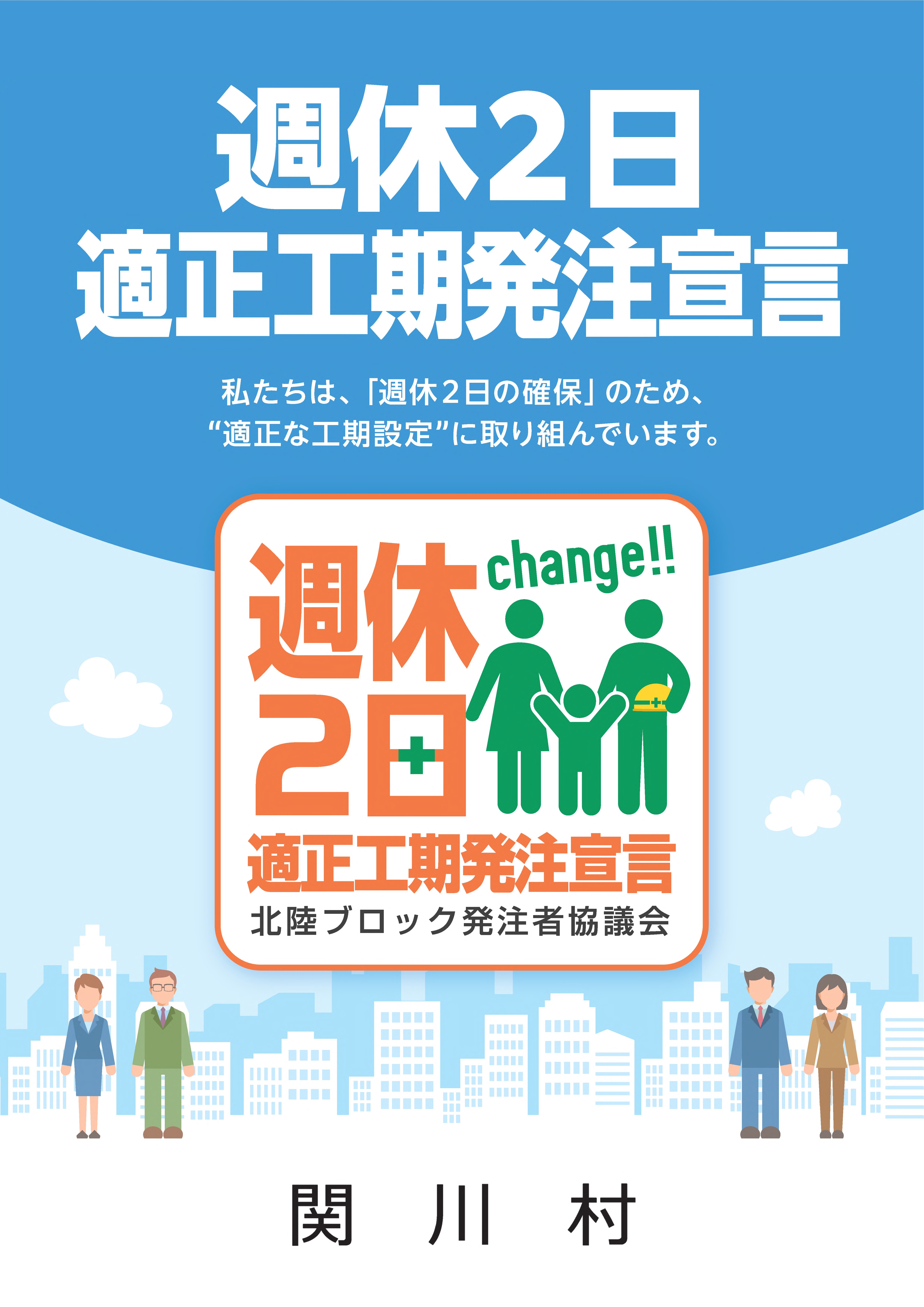 関川村は、建設業の「働き方改革」、建設現場の「週休2日(4週8休)の確保の実現に向け、"適正な工期設定"を行い、発注していることをここに宣言します。