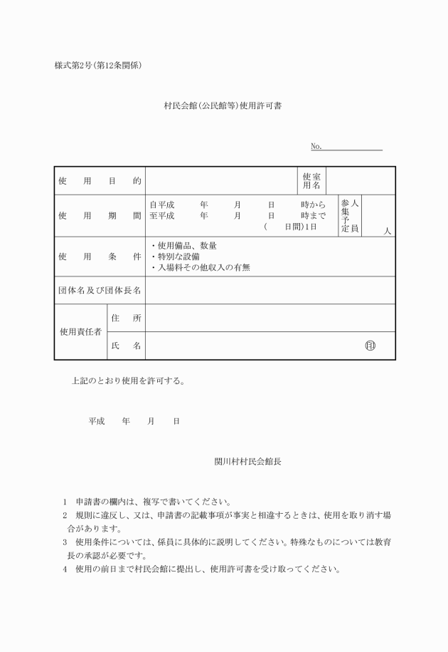 第12条 公民館等の施設又は設備(図書を除く。)を使用しようとする者は、原則として使用前日までに村民会館(公民館等)使用許可申請書(様式第1号)を館長に提出し、その許可を受けなければならない。