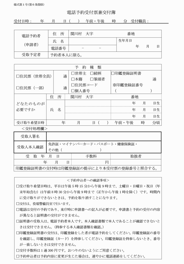 第1条 この要綱は、開庁日の執務時間内に来庁できない村民の利便性を図るため、電話による交付請求の予約の申込み(以下「電話予約」という。)を受けて行う証明書の交付に関して必要な事項を定めるものとする。