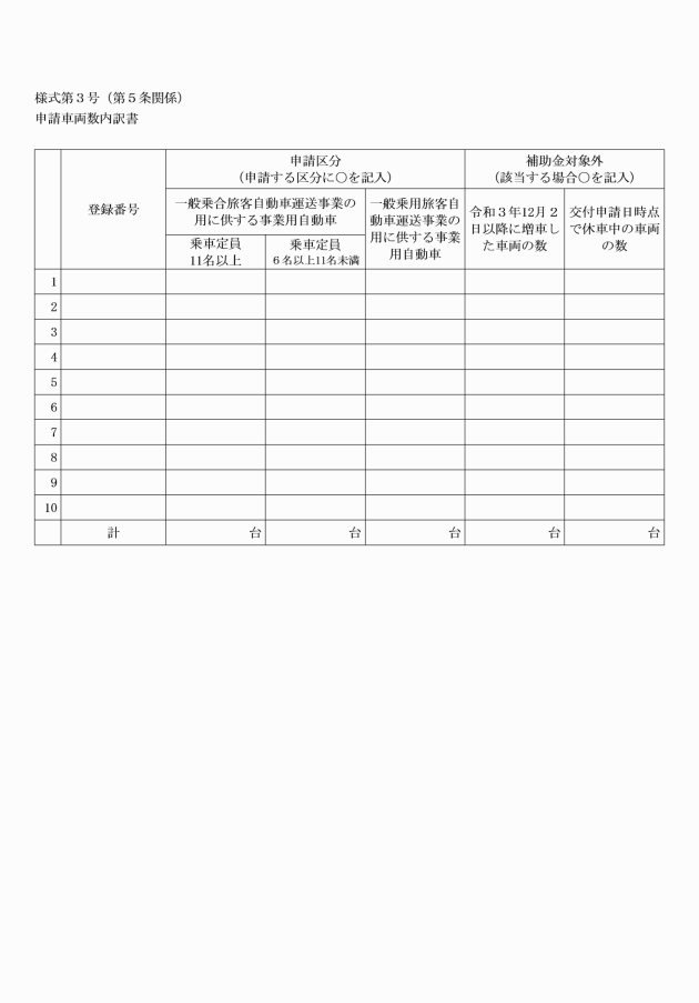 第3条 支援金の対象となる車両は、令和3年12月1日時点で国土交通省北陸信越運輸局新潟運輸支局に一般乗合旅客自動車運送事業又は一般乗用旅客自動車運送事業の用に供する事業用自動車として届出がされており、かつ交付申請日時点において運行を継続する車両(「新型コロナウイルスによる急激な需要低下に伴う休車の特例措置について」(令和2年3月31日付け国土交通省自動車局旅客課長事務連絡)による休車中の車両を除く。)とする。