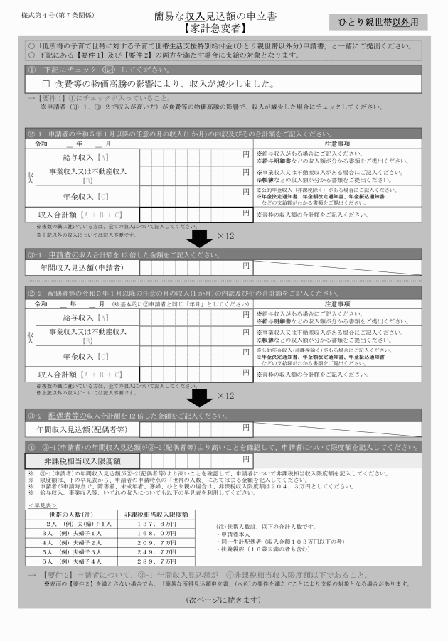 上記第1号に該当する者以外の者のうち、食費等の物価高騰の影響を受けて、令和5年1月以降の家計が急変し、地方税法(昭和25年法律第226号)の規定により、市町村民税均等割(同法の規定による特別区民税を含む。以下同じ。)が課されていない者、市町村(特別区を含む。以下同じ。)の条例で定めるところにより当該市町村民税均等割を免除された者と同様の事情にあると認められる者(当該者の1年間の収入見込額(令和5年1月から令和6年2月までの任意の1か月の収入に12を乗じて得た額をいう。)又は1年間の所得見込額(当該収入見込額から1年間の経費等の見込額を控除して得た額をいう。)が市町村民税均等割が非課税となる水準に相当する額以下である者をいう。)